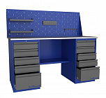 Верстак двухтумбовый поставляется в разобранном виде (4 элемента). Нагрузка на столешницу до 600 кг. Стандартный цвет: корпус - серый глянец RAL 7030, ящики и двери тумб - синий RAL 5017. Размеры: 855x1600x700 мм. Масса: 83 кг.