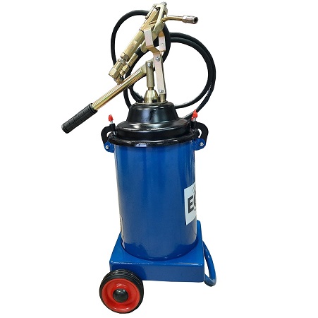 Нагнетатель смазки пневматический мобильный для шприцевания консистентной смазкой (солидолонагнетатель) производительностью 800 г/мин. Объем бака – 13 кг. При давлении воздуха 6-8 Атм давление смазки 350-400 Атм максимально. В комплекте раздаточный пистолет с жестким наконечником, адаптер для подключения 1/4”, шланг 4 м. Габариты: 510X310X685 мм, масса 18 кг.
