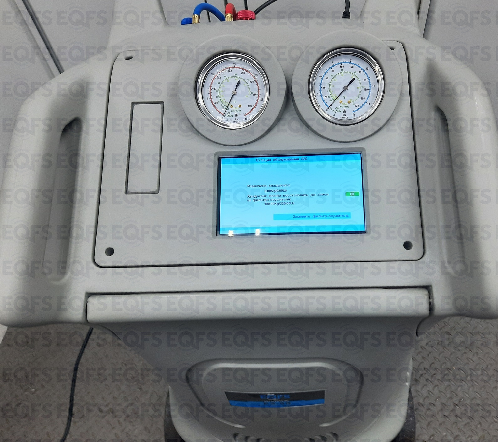 В установке реализована функция дозаправки без откачки и вакуумации. Дозаправку выполняют в ручном режиме, контроль осуществляют по показаниям манометров.