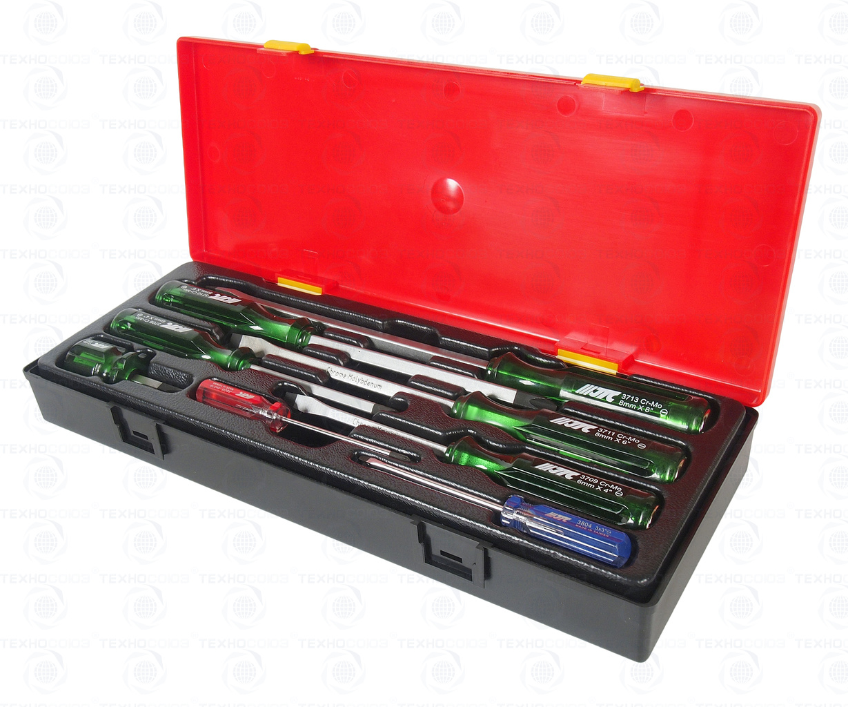 • JTC-3708-3713: отвертки со сквозным стержнем: минус 6x100 мм., 8x150 мм, 8x200 мм., плюс #2x100 мм., #3x150 мм. - всего 5 шт.