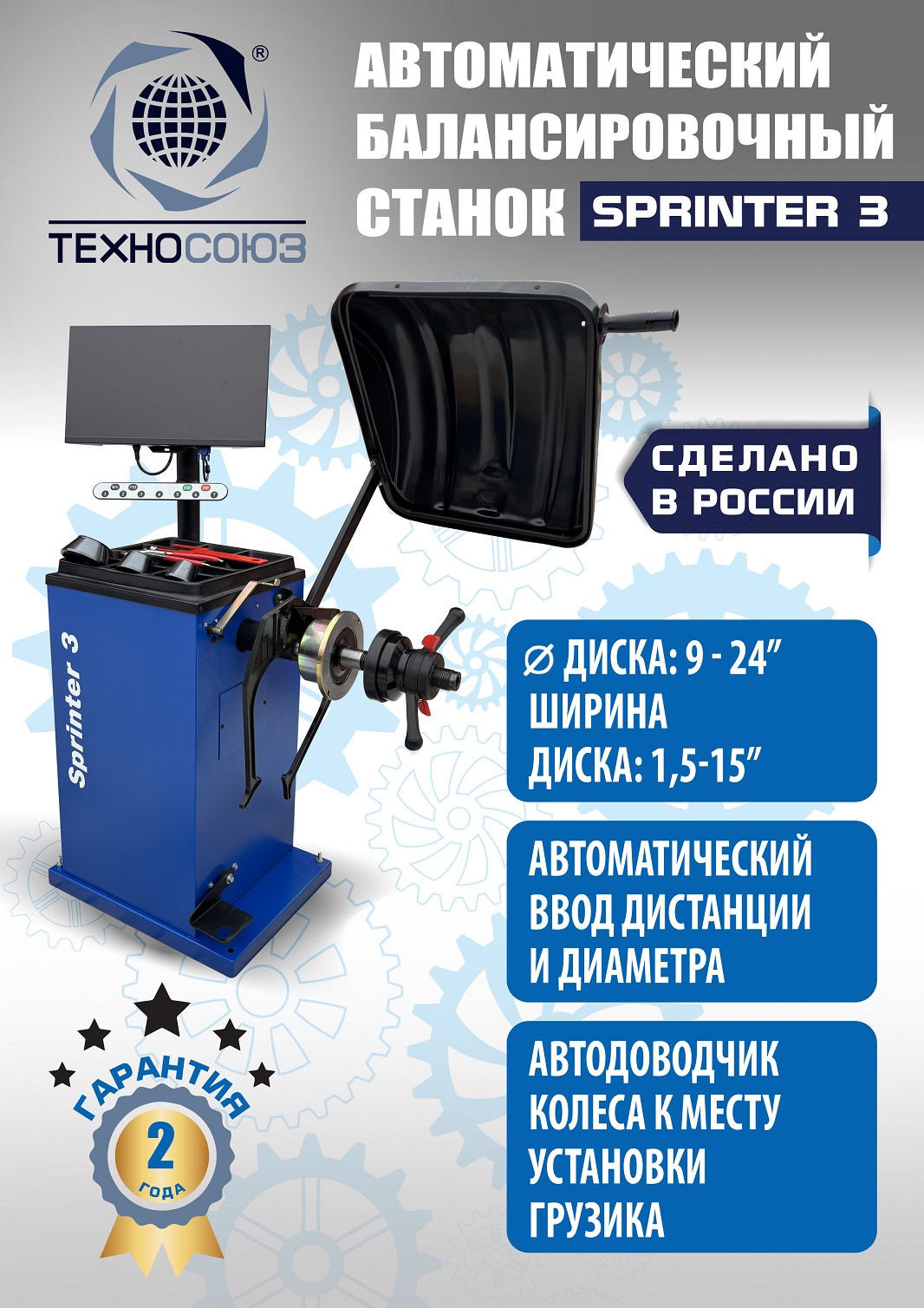 Балансировочный станок для колес легковых автомобилей Sprinter 3. ПРОИЗВОДСТВО РФ. Автомат.  LCD Монитор с понятным управлением. Автоматический и прямой ввод всех параметров для колес с алюминиевыми дисками. Автоматический доводчик. Автоматическое закручивание гайки. Электронная линейка. Многофункциональная педаль управления для работы без нажатия кнопок. Статистика и учет расхода грузиков. Вал 40 мм шлифованный. Для колёс легковых авто и коммерческого транспорта с диаметром диска с резиной до 850 мм. Размеры диска: ширина 1–15” , диаметр диска 9–24”. Вес колеса 65 кг.  Гарантия 2 года.