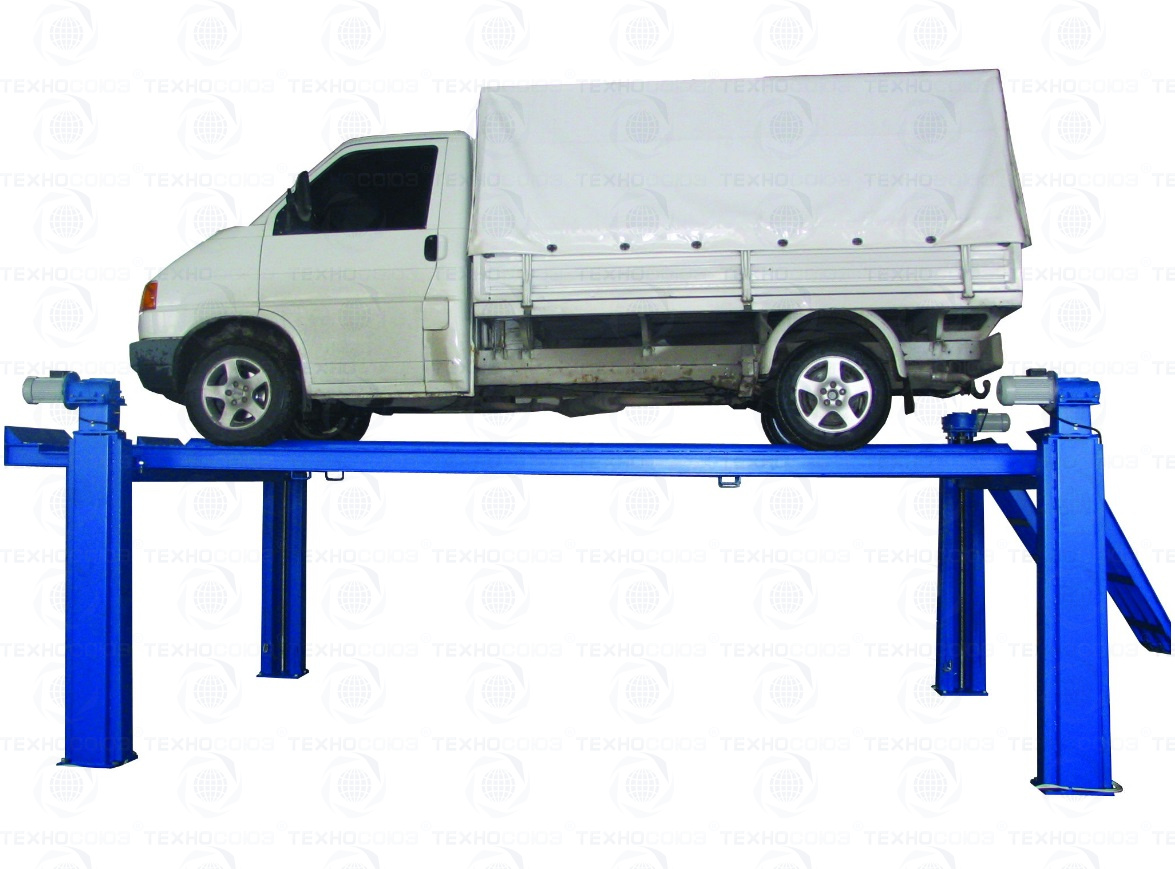 Электромеханический подъемник. Подъемник обеспечивает подъём любых автомобилей снаряженной массой до 5 тонн. Может устанавливаться на бетонируемые в пол рамы или на напольные рамы закрепляемые на полу анкерными болтами. Напольные рамы и анкерные болты поставляются вместе с подъемником по отдельному заказу. Рабочие гайки выполнены из полиамида повышенной прочности и износостойкости. Многоуровневая система безопасности. Привод ходового винта от червячного мотор-редуктора. По отдельному заказу подъёмники могут быть укомплектованы тележкой с домкратом для вывешивания передней или задней оси автомобиля. Подъемник комплектуется микропроцессорной системой синхронизации подъёма-опускания платформ. Подъемник специально разработан для установки стенда регулировки развала-схождения передних колес автомобилей.