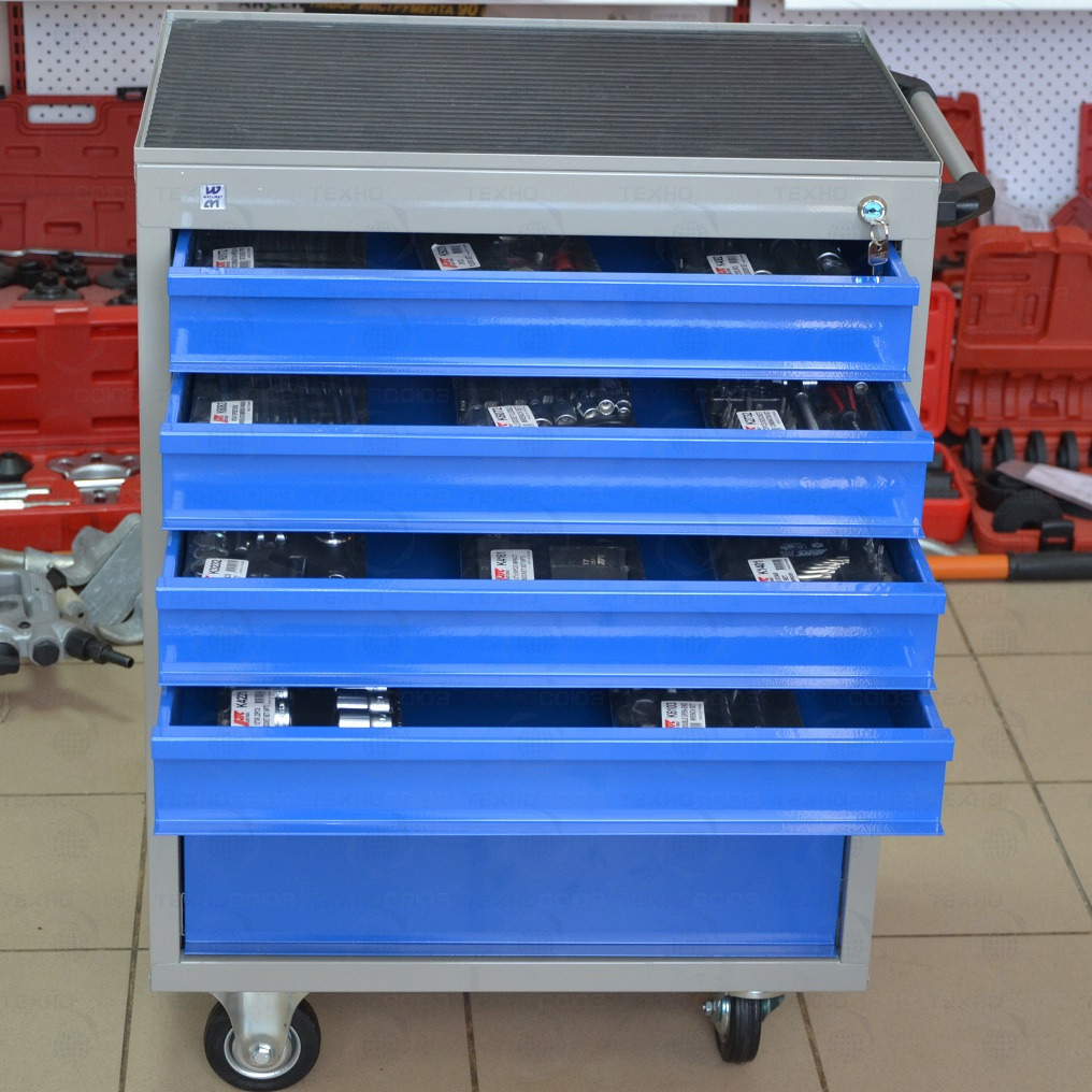 Данный набор инструмента включает: тележку инструментальную с 4 ящиками, комбинированные ключи, наборы головок и отверток, клещи, утконосы, щипцы и трещотку - это тот самый минимум, который понадобится при работе в гараже или СТО.