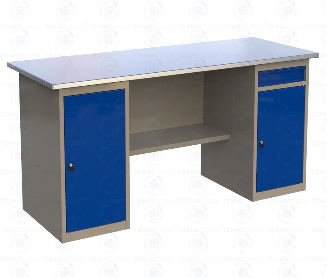 Верстак двухтумбовый поставляется в разобранном виде (4 элемента). Нагрузка на столешницу до 600 кг. Стандартный цвет: корпус - серый глянец RAL 7030, ящики и двери тумб - синий RAL 5017.  Размеры: 855x1800x700 мм. Масса: 91 кг.